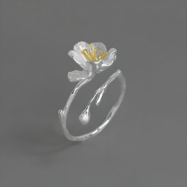 Adjustable S925 Sterling Silver Haitang Flower Open Ring Literary Vintage Style