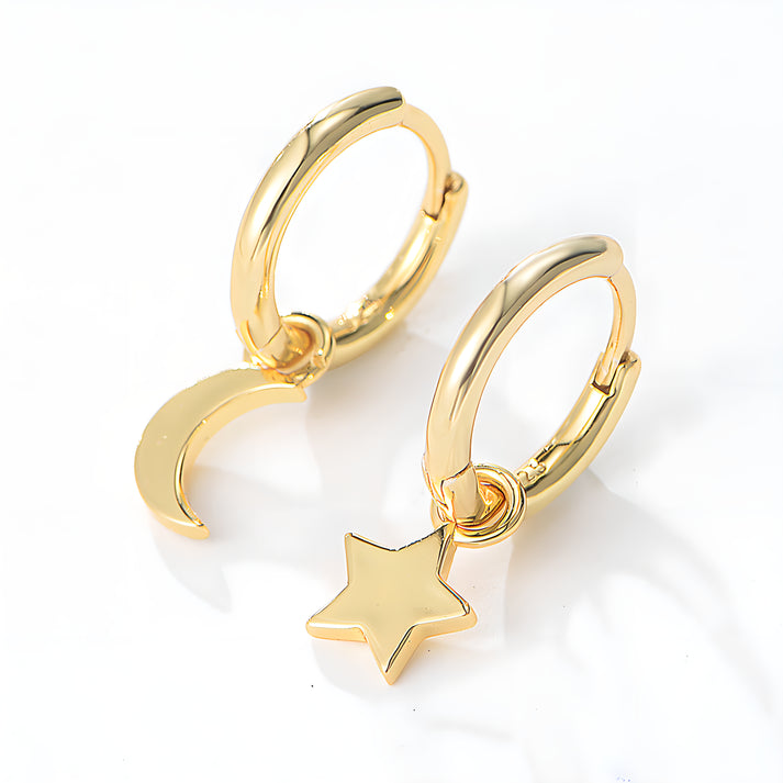 Asymmetrical Star & Moon Dangle Earrings in S925 Sterling Silver