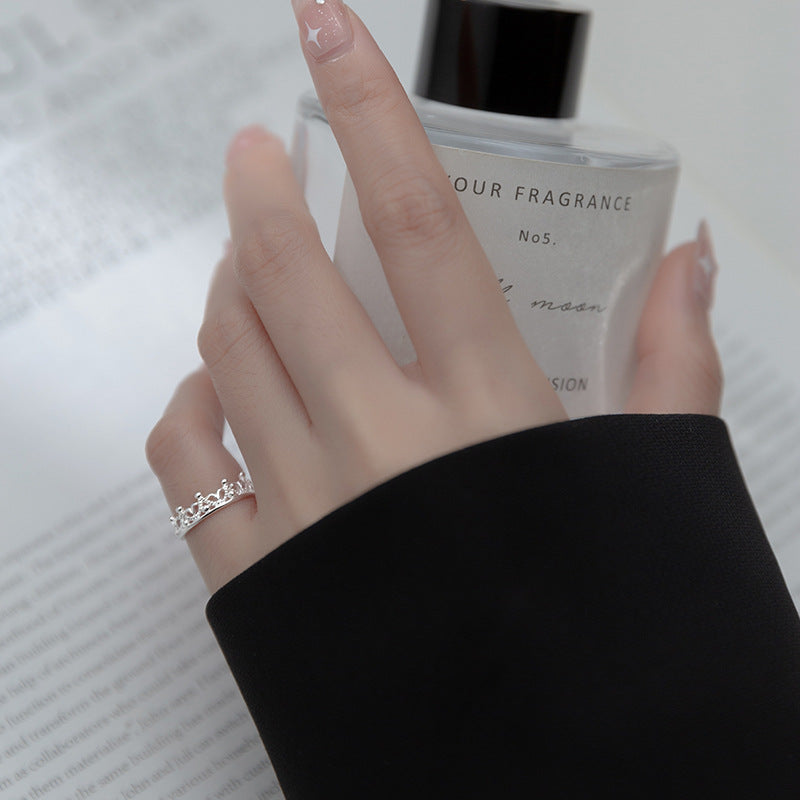 Delicate S925 sterling silver ring with a small hollow crown design. Features an adjustable open band for comfortable fit, blending retro vintage charm with modern simplicity. Ideal for everyday elegance or layering with other pieces.
