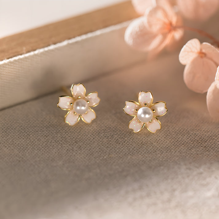 S925 Silver Light Pink Cherry Blossom Beaded Stud Earrings